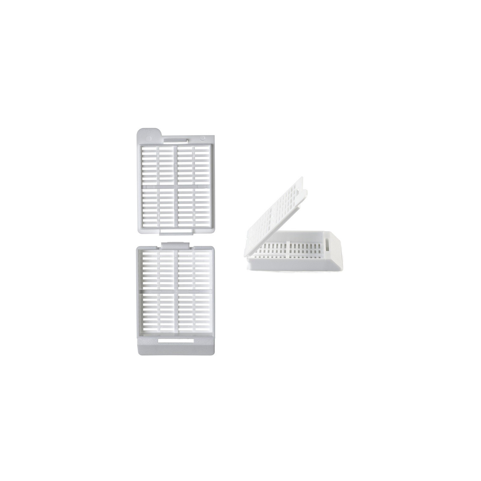 These disposable plastic cassettes hold tissue specimens during processing and embedding, as well as in storage. Molded from acetal, they keep specimens safely submerged in liquid and are resistant to the chemical action of most histological solvents. The efficient flow-through slots maximize fluid exchange and ensure proper drainage.