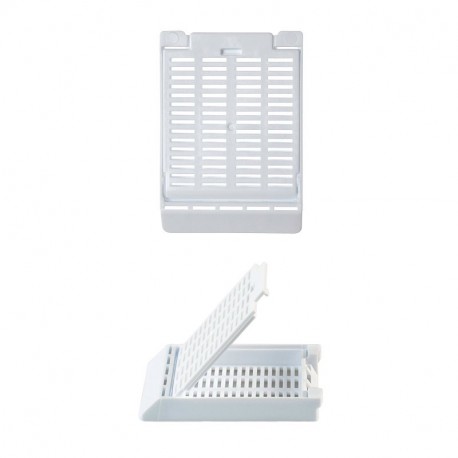 La SLIMSETTE™ incorpore un couvercle encastré unique, une grande fonctionnalité permettant d'économiser de l'espace, ce qui permet d'empiler davantage de cassettes dans des étiqueteuses automatiques et des armoires de rangements. La SLIMSETTE™ assure un échange de fluide et un drainage efficaces grâce à 114 ouvertures de 1 x 5 mm chacune. La zone d'écriture antérieure est inclinée à un angle de 45 °.
